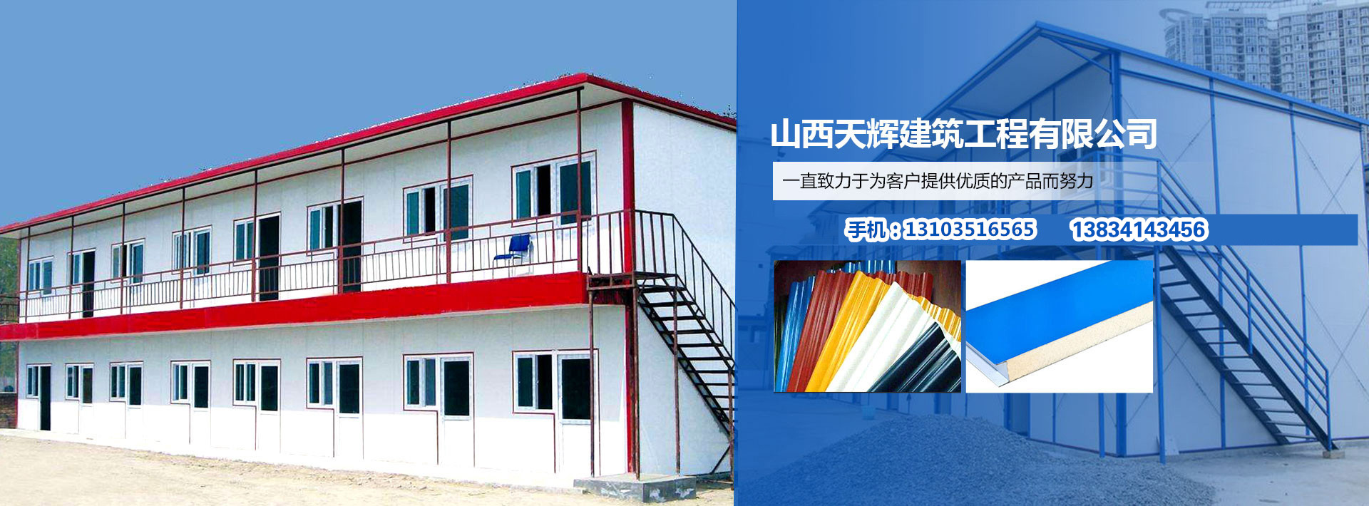 山西天輝建筑工程有限公司是專業(yè)從事彩鋼板生產(chǎn),鋼結(jié)構(gòu)、住人集裝箱、活動(dòng)房設(shè)計(jì)和專業(yè)安裝、維護(hù)的一家企業(yè),我們銷售的產(chǎn)品引進(jìn)全自動(dòng)彩鋼夾芯板流水線以銷售多種規(guī)格的彩鋼復(fù)合夾芯板...